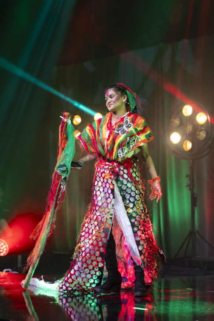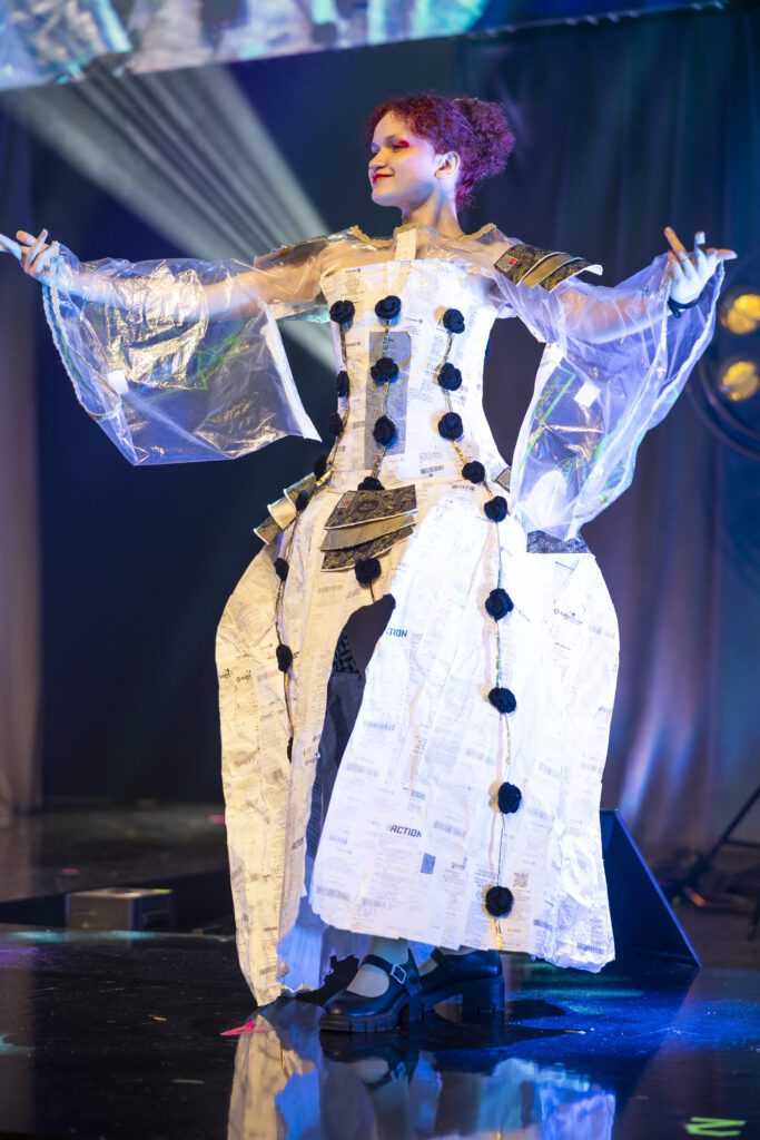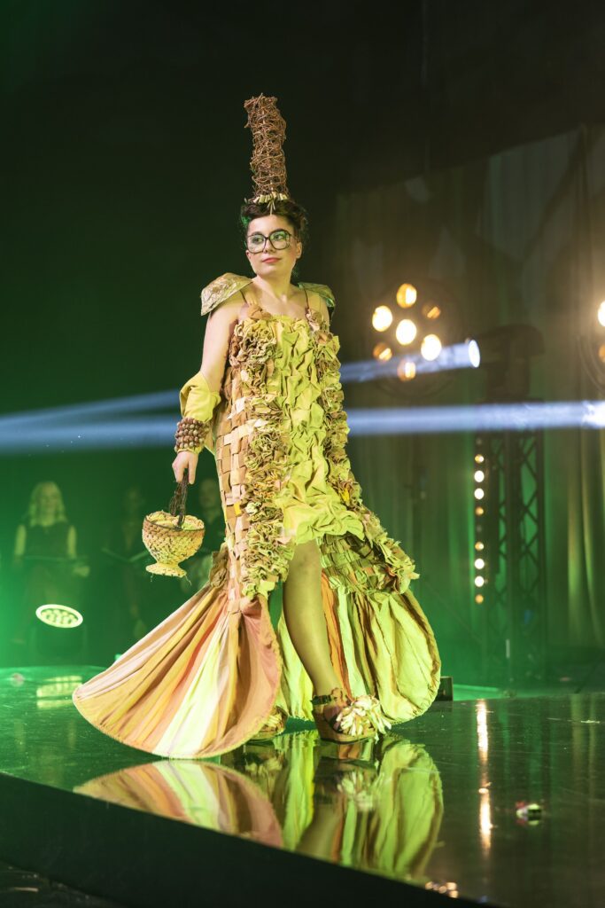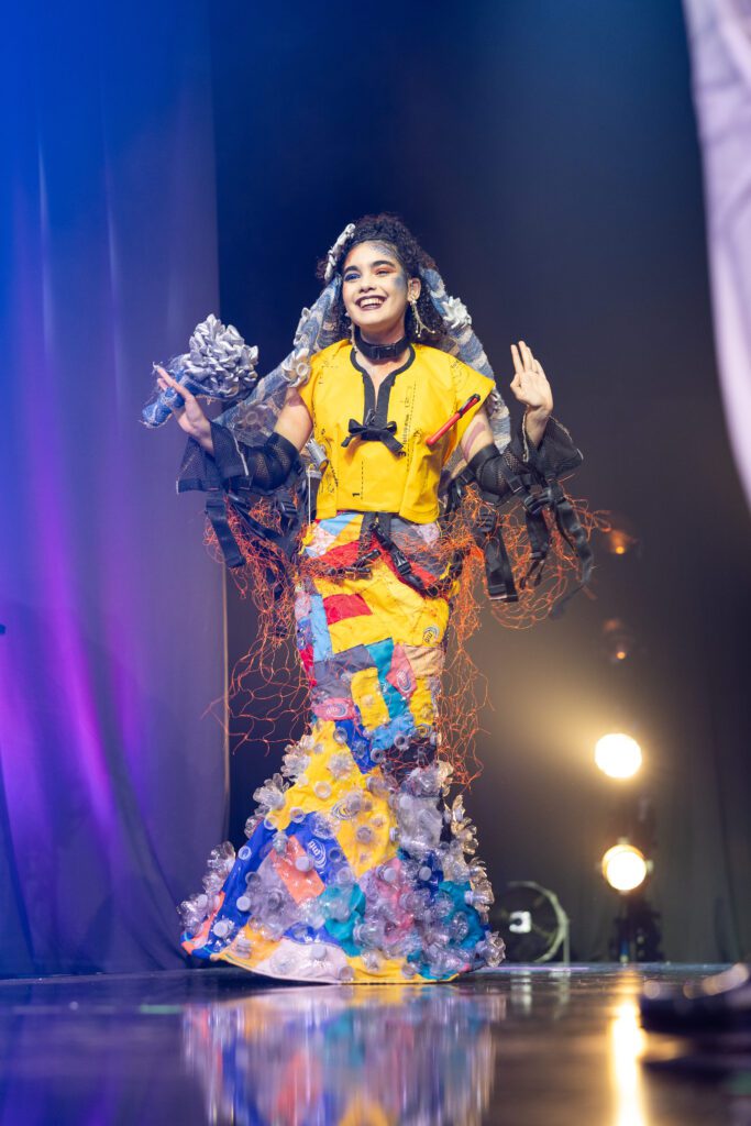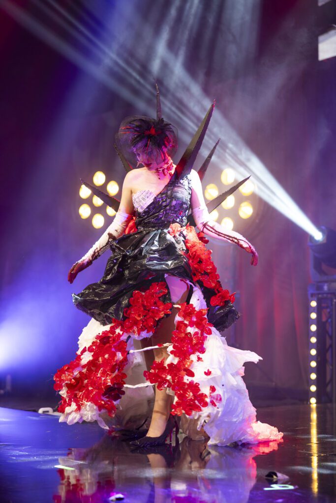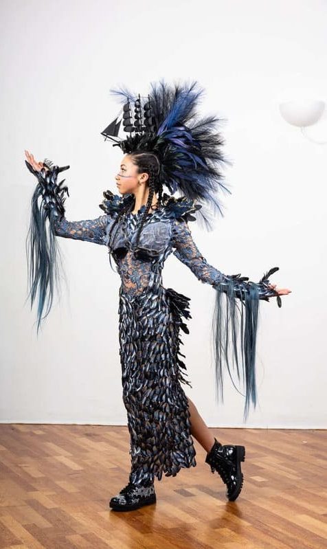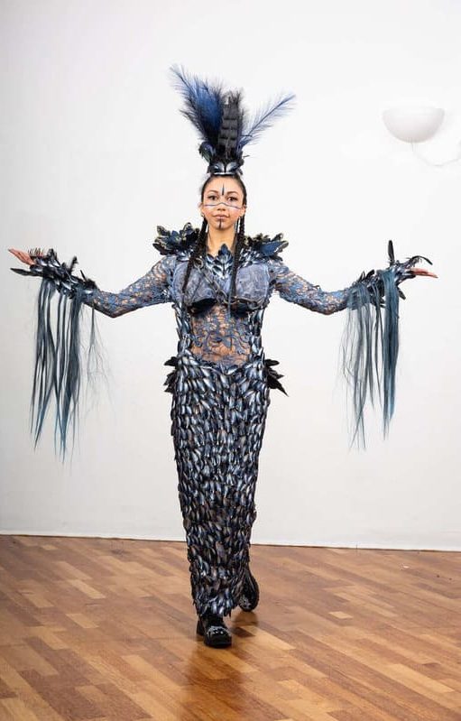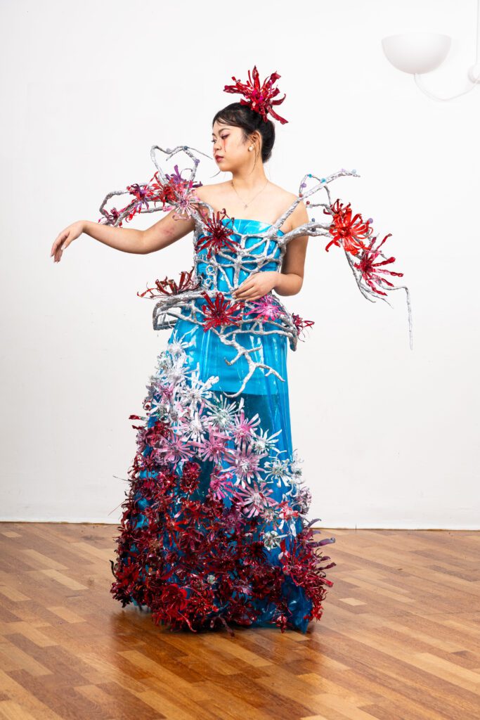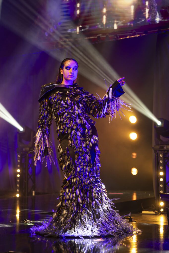 Inspired by world hunger, ‘Aquacultural’ promotes blue farming as a sustainable solution. Over 2,000 mussel shells, scrubbed, glazed, and layered onto lace, create a rippling ocean effect. Mussel farming is one of the most sustainable food sources and an accessible industry for women, bridging gender inequality in agriculture. A Dalian Mohawk headpiece features a ship on salvaged foam, symbolising rebellion and empowerment. Overall, this 32kg organic waste design champions sustainable food production and gender equality.