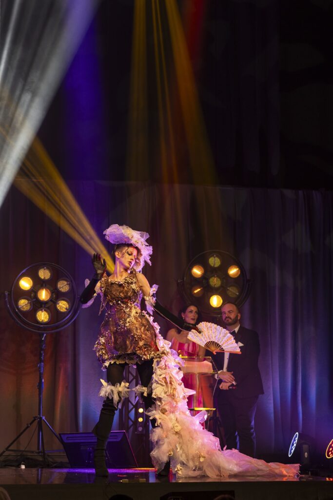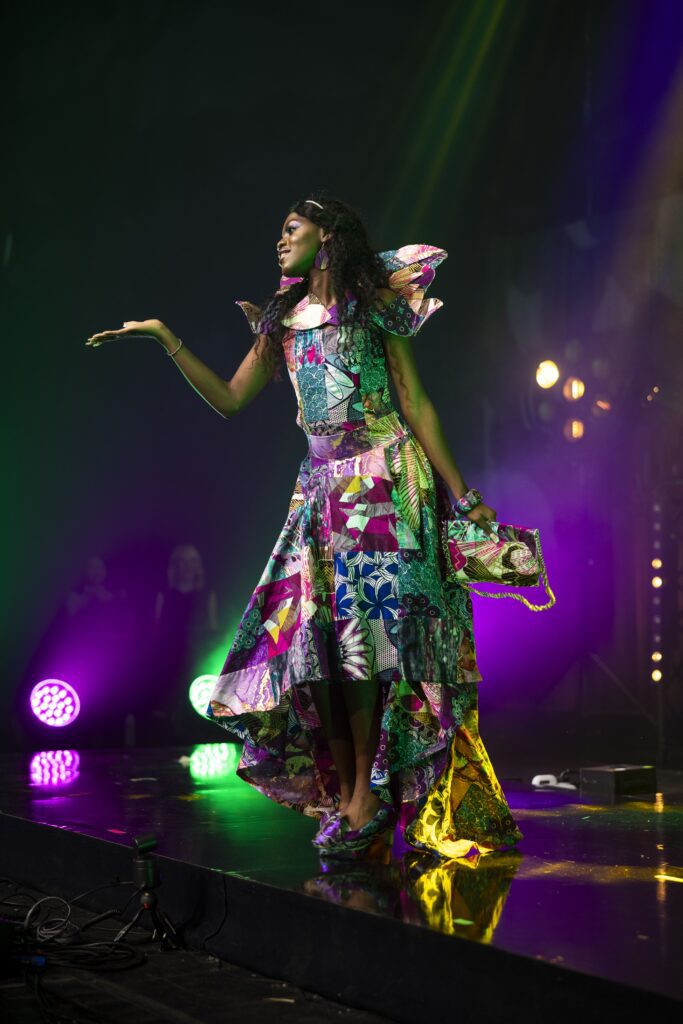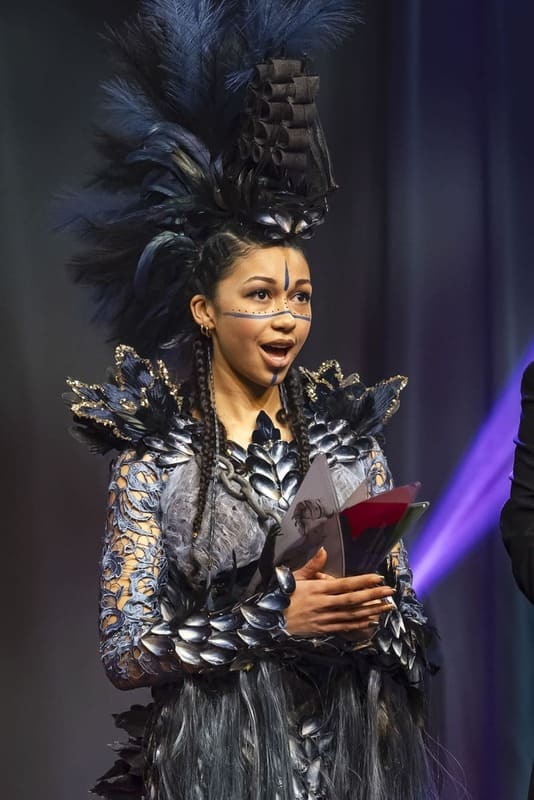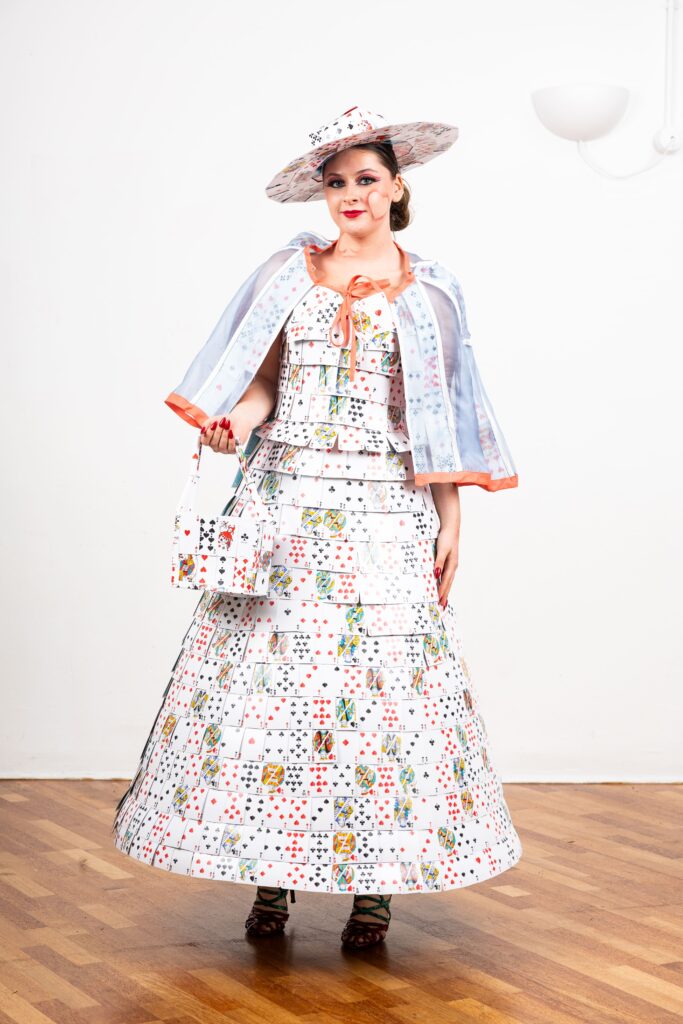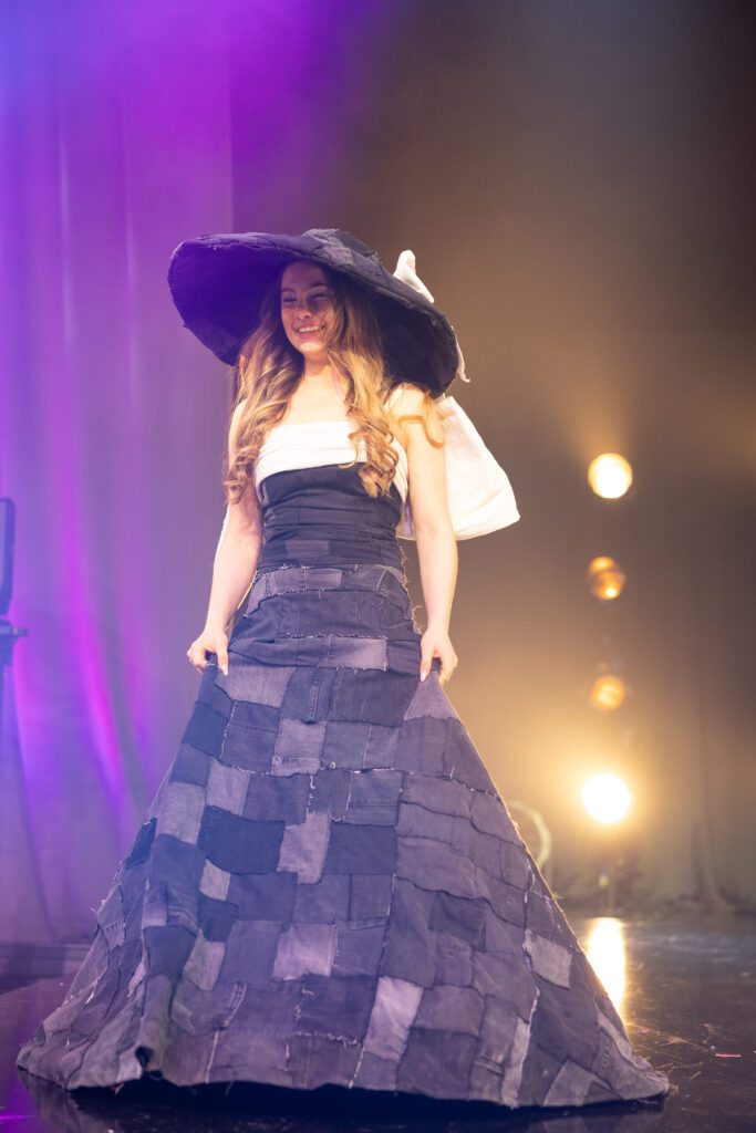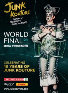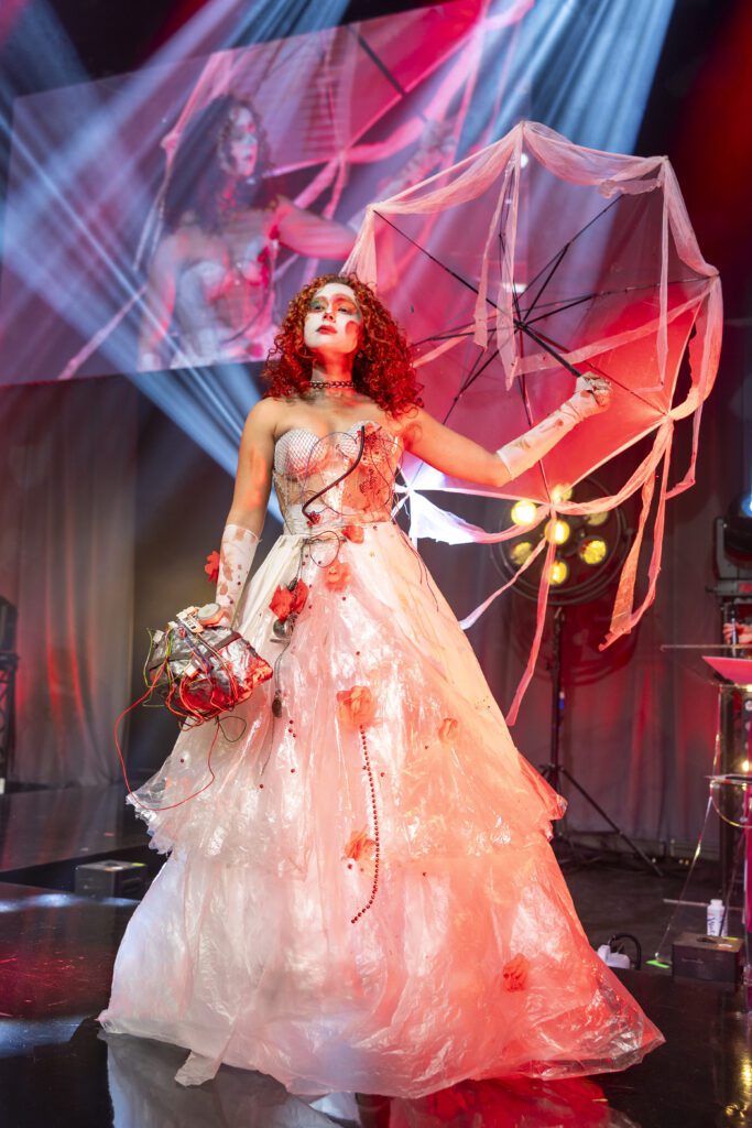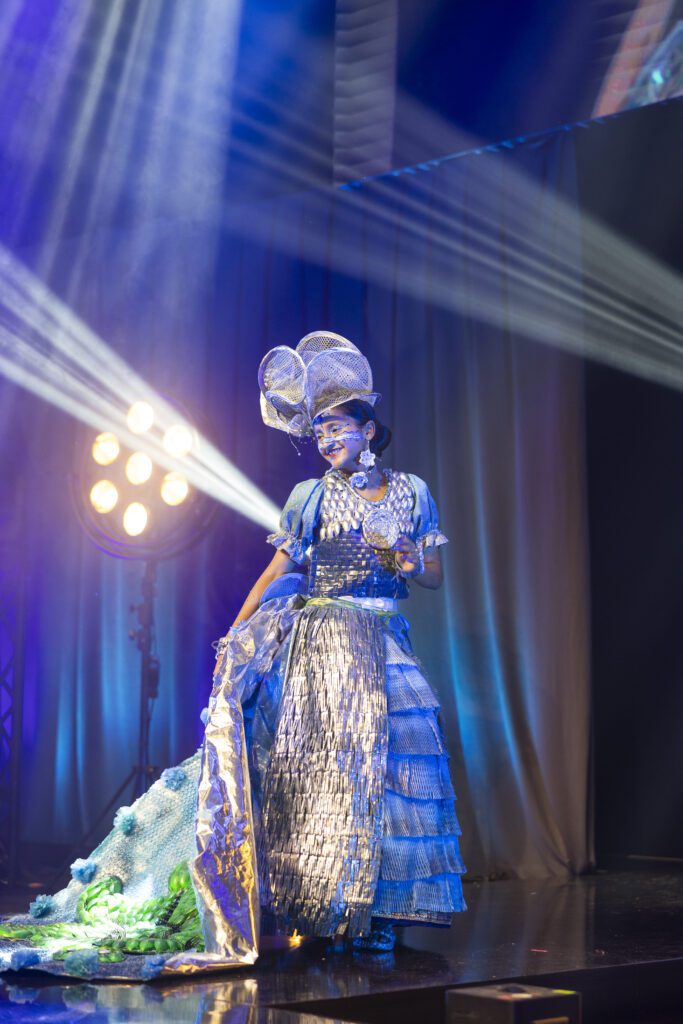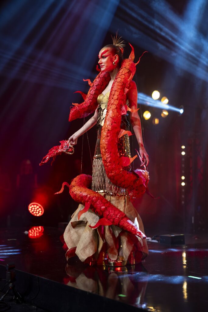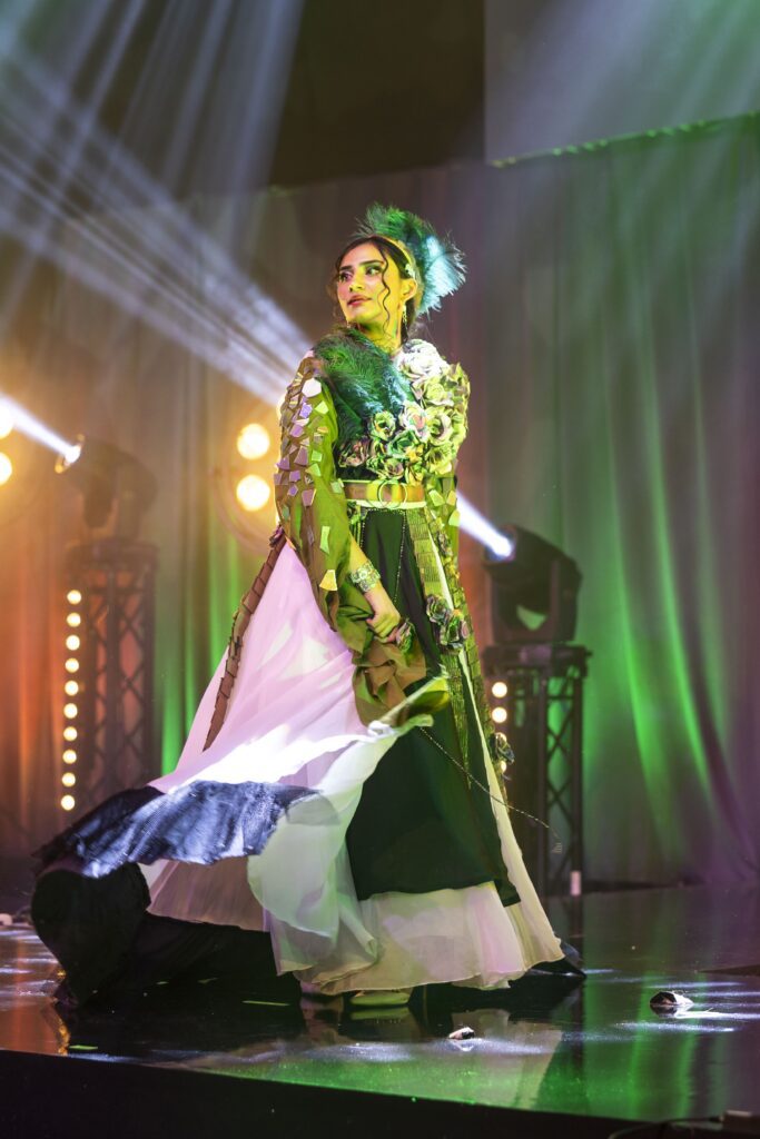 Inspired by world hunger, ‘Aquacultural’ promotes blue farming as a sustainable solution. Over 2,000 mussel shells, scrubbed, glazed, and layered onto lace, create a rippling ocean effect. Mussel farming is one of the most sustainable food sources and an accessible industry for women, bridging gender inequality in agriculture. A Dalian Mohawk headpiece features a ship on salvaged foam, symbolising rebellion and empowerment. Overall, this 32kg organic waste design champions sustainable food production and gender equality.
