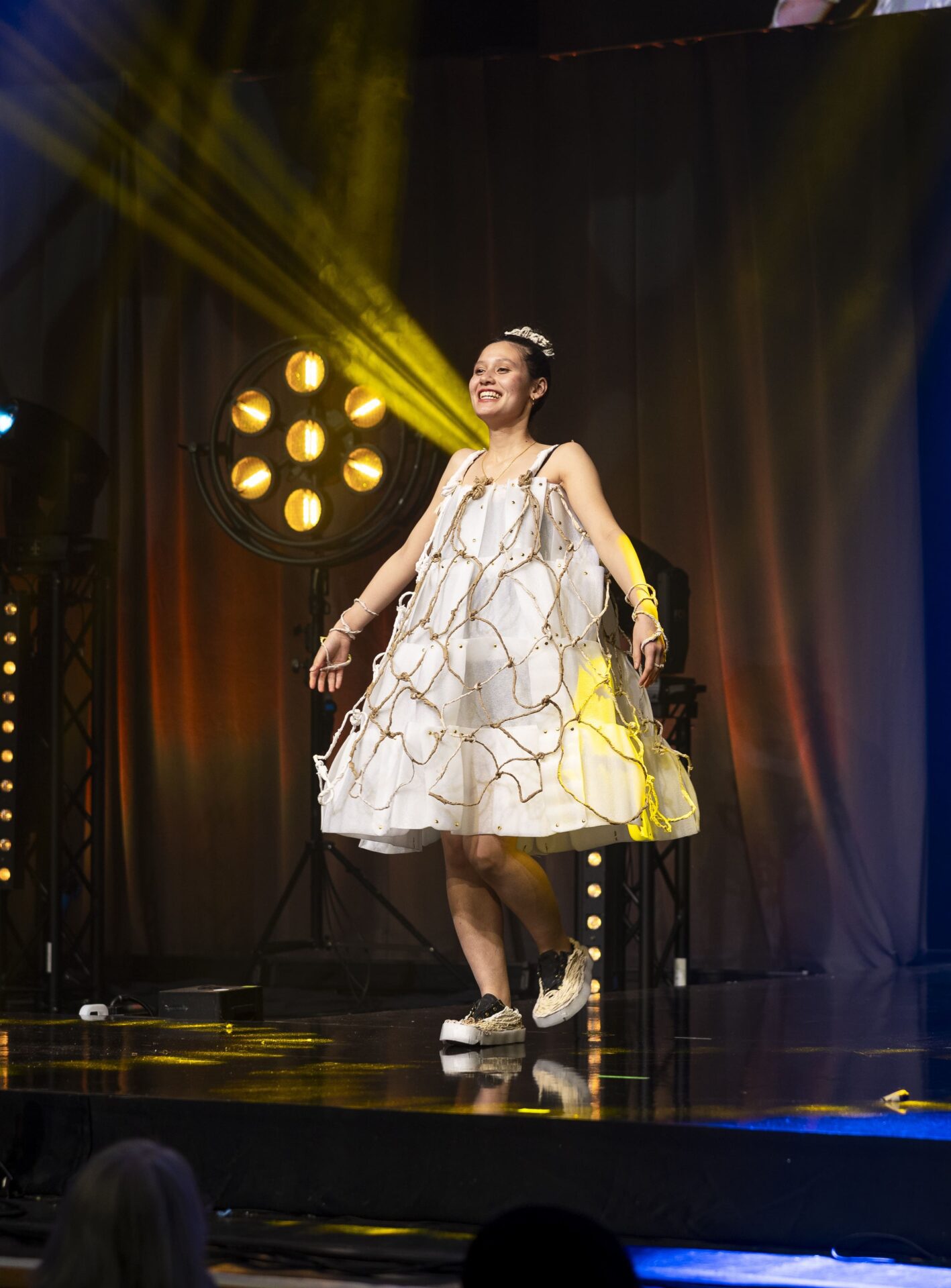 Inspired by heritage, migration, and identity, ‘Dumpling’ captures the bicultural experience of its British-Chinese designers. The structured white silhouette mirrors xiao long bao, symbolizing their connection to Chinese culture, while the macrame-style netting represents Scottish heritage, blending two worlds. More than a tribute, it captures the struggle of belonging to both yet fully fitting into neither. Made from packing materials from their move from Hong Kong to Edinburgh, each element is stitched together, symbolizing immigration and adaptation.