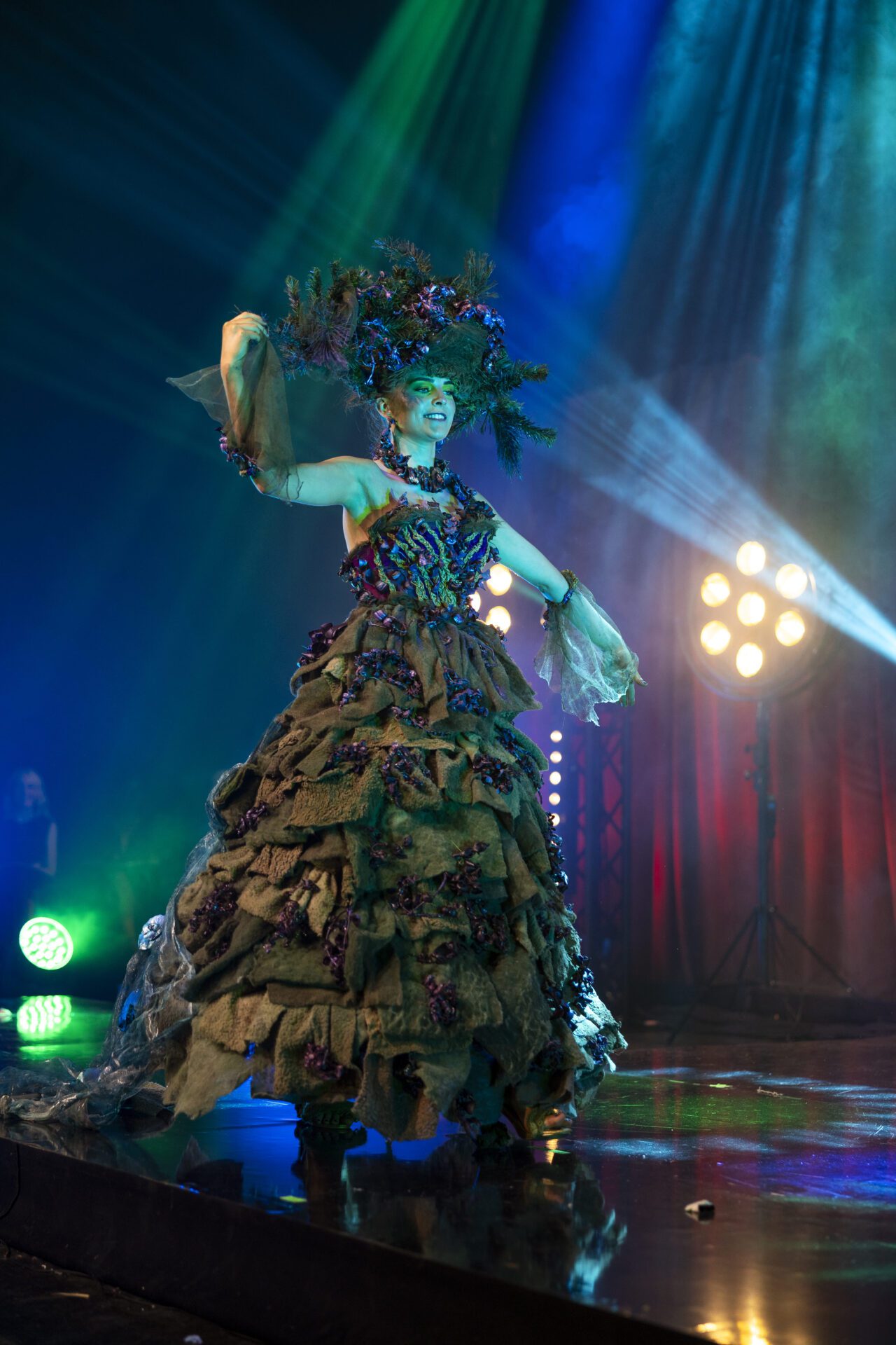 Inspired by concerns over local bogland litter, ‘Lady of the Landscape’ celebrates nature’s beauty and the impact of waste. The design features a Rara-style skirt and an asymmetrical peplum top woven with vivid purple heather and earthy greenery for a rustic charm. Using hand-dyeing and laser cutting, 2.4kg of duvet wadding from 3 duvets and 100 plastic bottles—6kg of waste in total—are transformed into wearable art. A kinetic waterfall detail adds movement and serves as a powerful call to protect our environment.