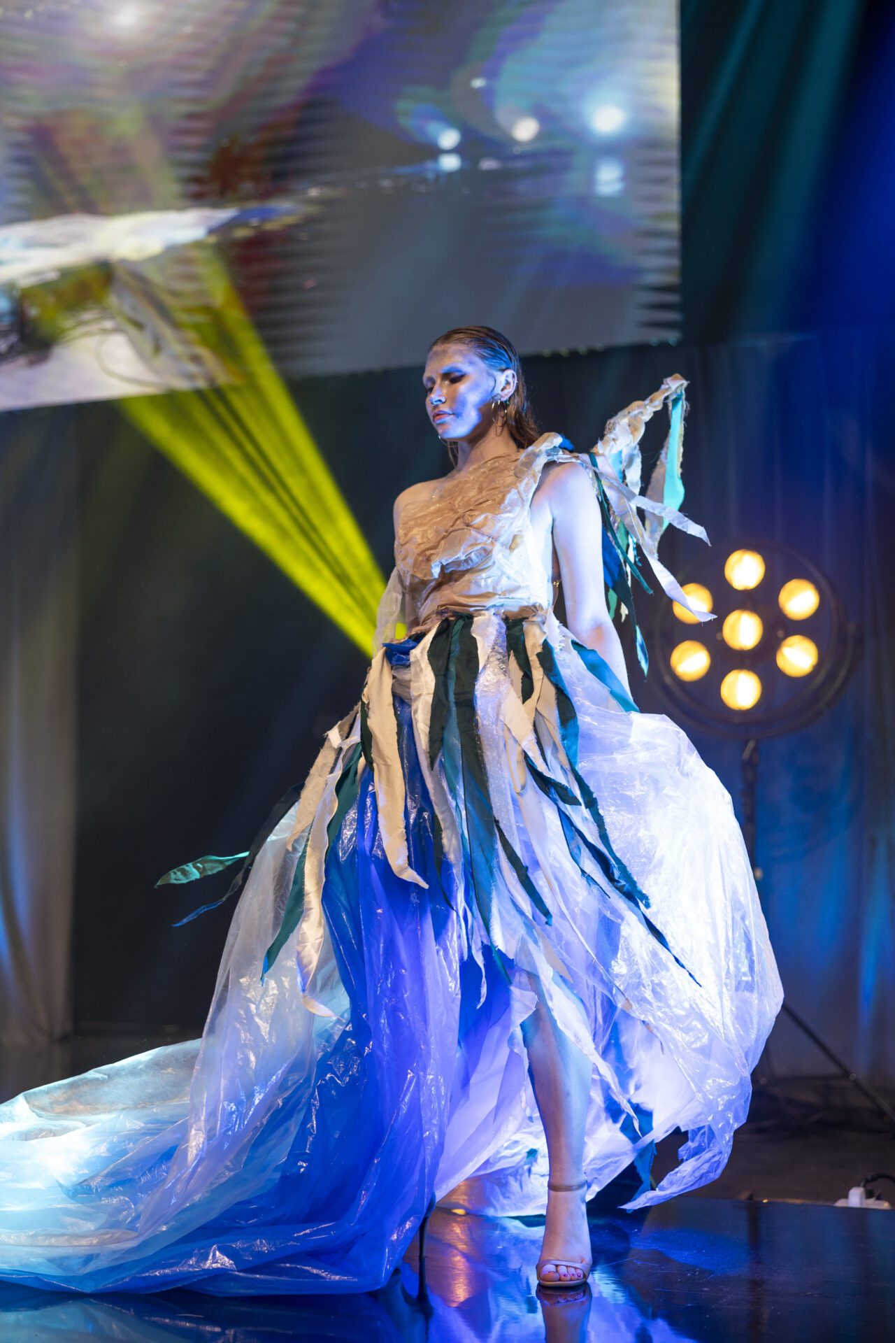 Inspired by marine pollution and hidden industrial waste, ‘Mer Made of Plastic’ transforms 18m of discarded plastic and 20 aluminium cans into a striking ocean-inspired design. The layered plastic skirt, made from flour bags and mattress packaging, mimics water’s movement, while the moulded satin bodice, shaped with wire, creates ripples like the ocean’s surface. Inspired by bio-mimicry, Alexander McQueen, and Kim Kardashian’s ‘wet look’, this piece blends fashion with activism, revealing the unseen waste polluting our seas.