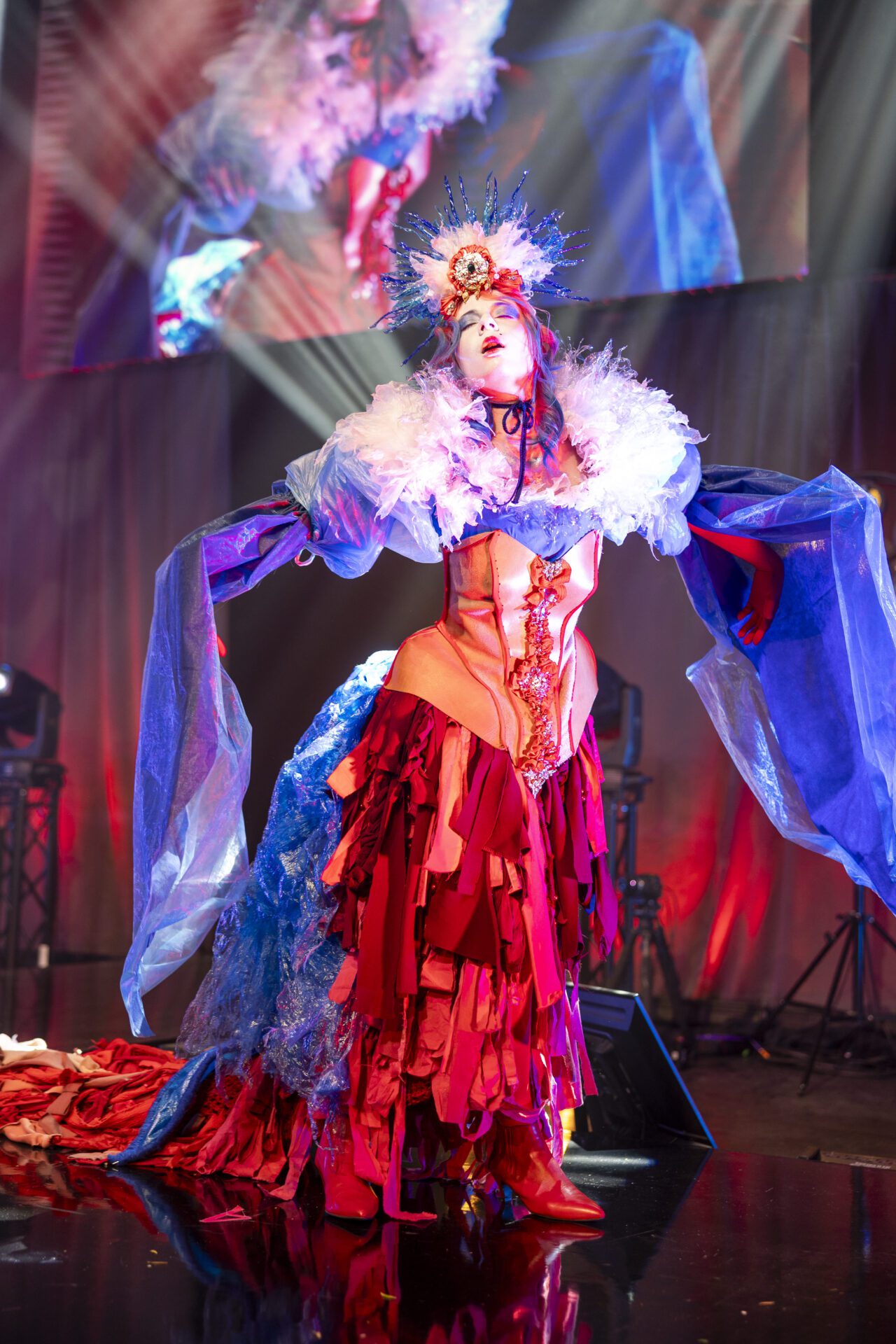 Inspired by 19th-century fashion and the devastating impact of whaling, ‘Mermurder’ highlights the exploitation of whales and ocean pollution. The corset, made from 1kg of leather scraps, reflects the industry that drove whale hunting to its peak, while the red and blue fabrics symbolise the bloodshed and vast ocean waters. The fin-shaped sleeves and handmade plastic jewellery mirror marine life and the 200 pieces of plastic whales can ingest daily. Every element was hand-sewn without adhesives.