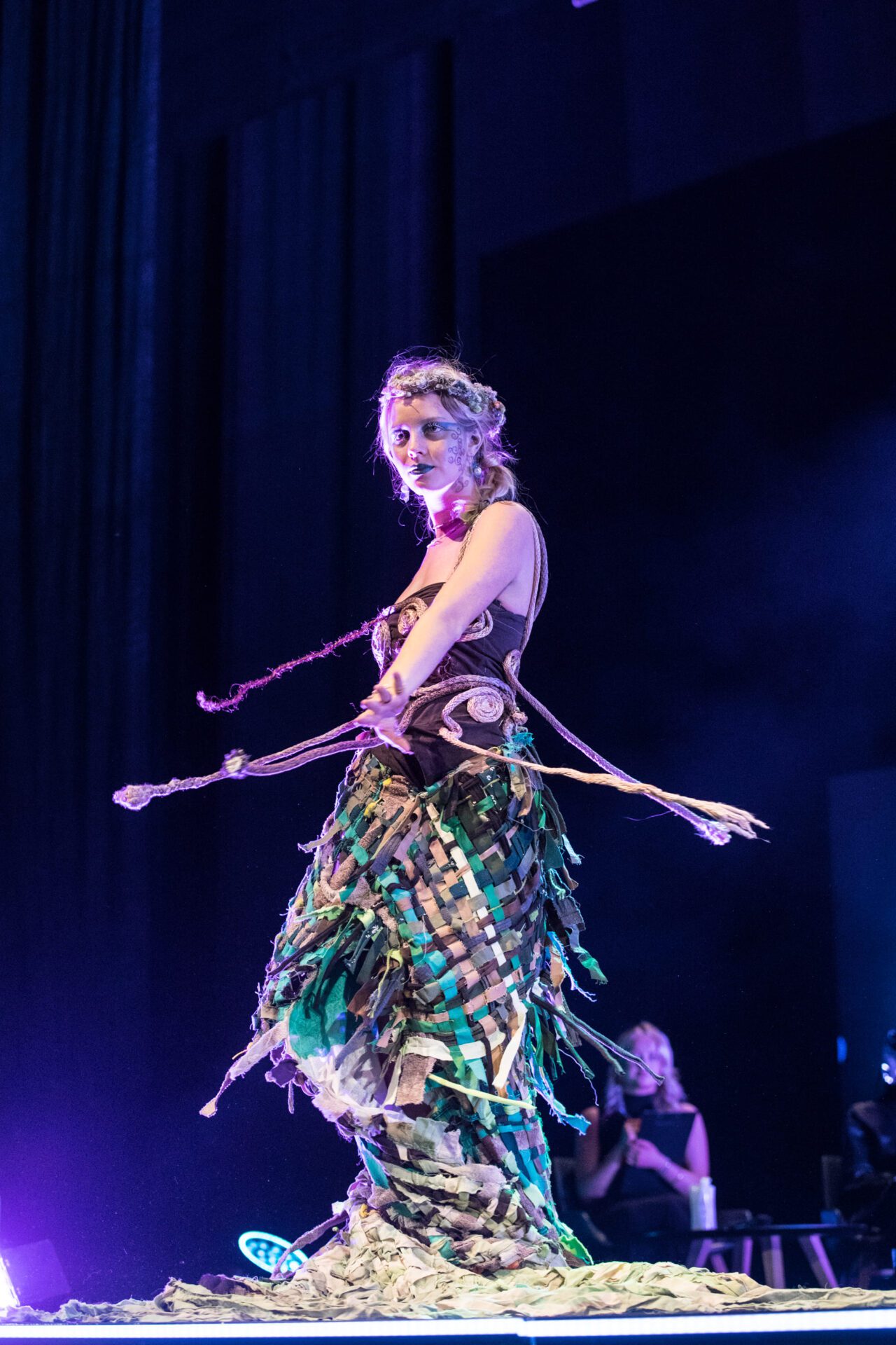 The design represents humans being taken over by nature & how powerful nature is by having the overgrown “plants’ seemingly growing onto and covering the model. The moss-like headpiece helps make the model look less human by obscuring her identifying features and making her look more like she is part of nature.