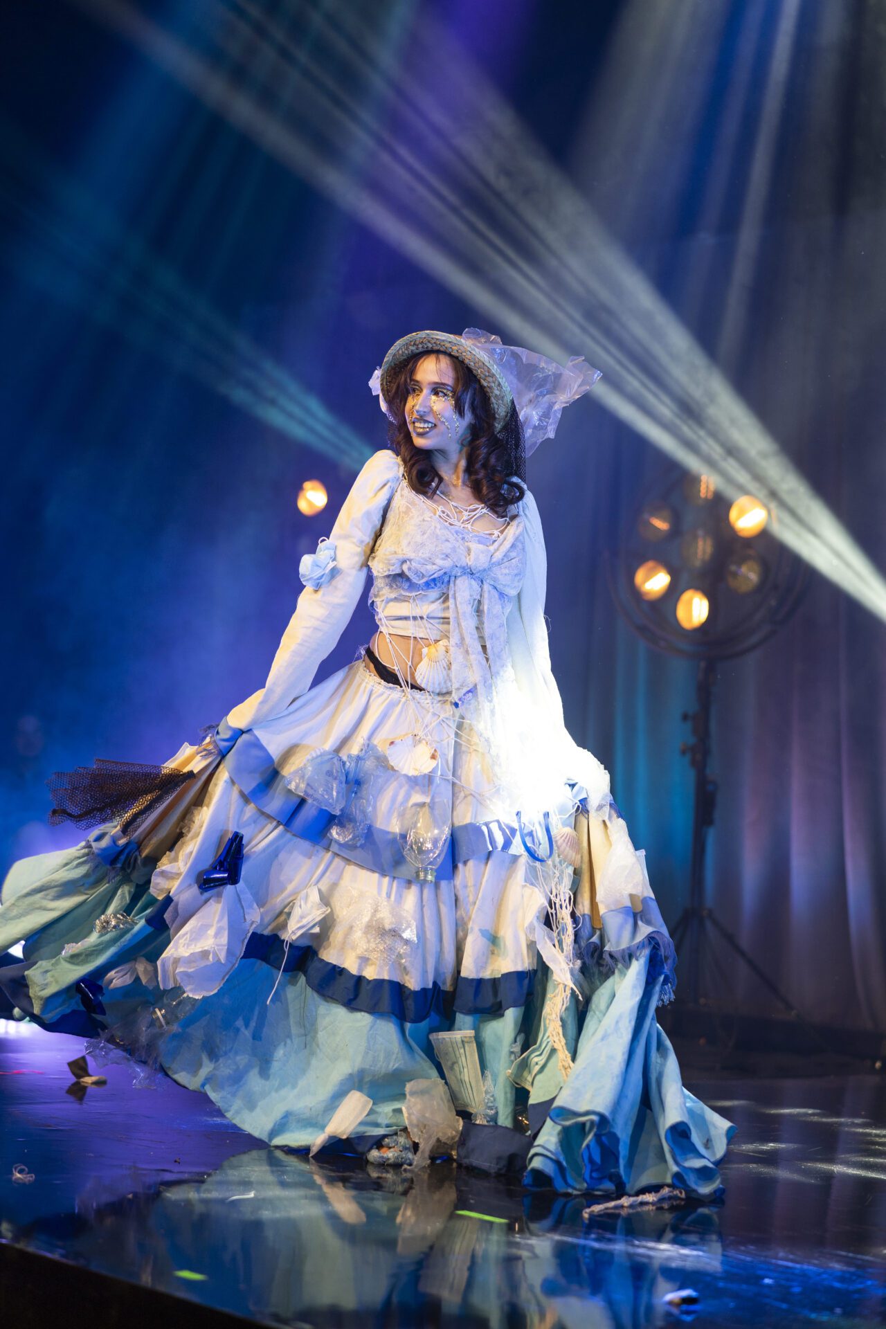 Inspired by the beauty of the Mediterranean Sea and the pollution harming it, ‘New Wave’ combines fashion with a message for change. The flowing sleeves and ocean-inspired colors capture the sea’s beauty, while reused plastics and old fabrics show the impact of waste on marine life. Fishing nets and seashells represent the struggles of ocean creatures, reminding us to protect our waters. This design turns waste into a powerful statement, calling for action to keep our oceans clean.