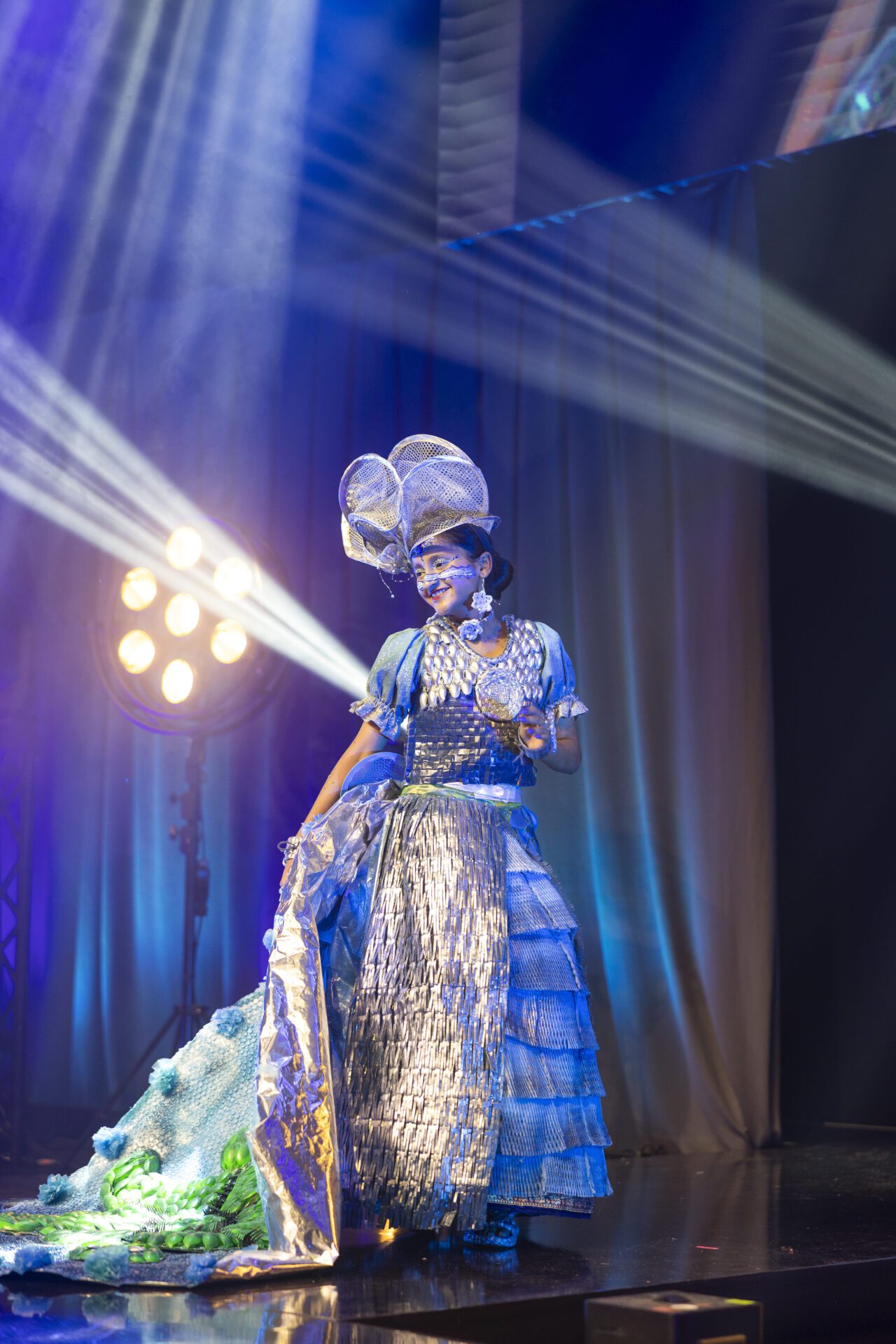 Inspired by the green turtles and the UAE’s coastal heritage, ‘Oceanic Opulence’ merges Victorian elegance with sustainability. This handcrafted design uses sewing, layering, weaving, and mosaic work to highlight ocean conservation. Made from 2m of bubble wrap, 4m of silver packaging, and over 400 pieces of plastic cutlery, the flowing skirt and layered train symbolise the fragility of marine ecosystems. Weighing 2kg, Oceanic Opulence transforms waste into couture, urging action to protect our oceans and endangered species.