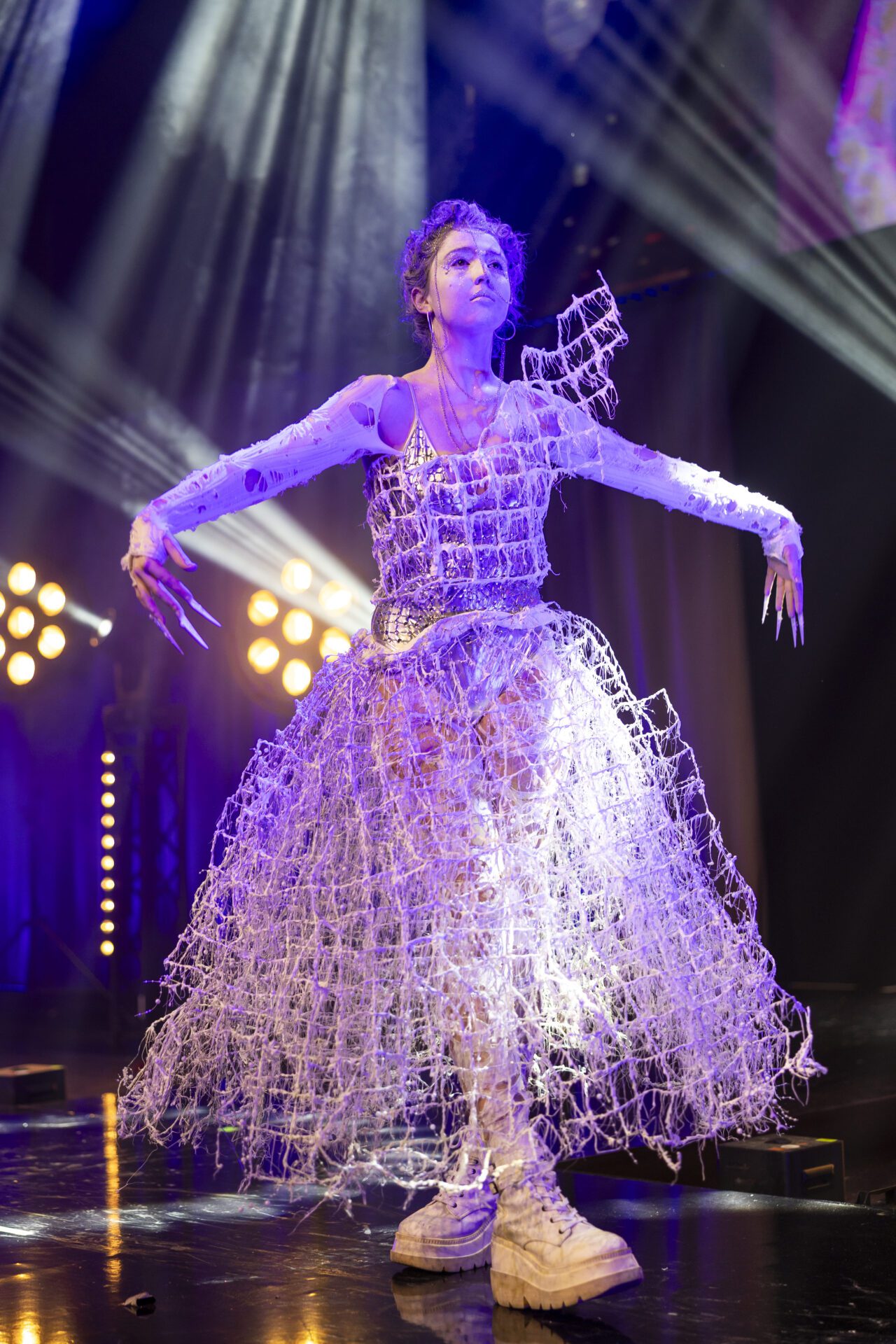 Inspired by melting glaciers, ‘White Soul’ blends fashion with environmental awareness. Cool white tones reflect the purity of ice, while transparent details symbolize the fragility of polar ecosystems. Flowing elements mimic water’s movement, highlighting the urgency of climate change. Made with wire mesh and white pearls, the design is a reminder of our planet’s rapid transformation and the need for immediate action to protect its future.